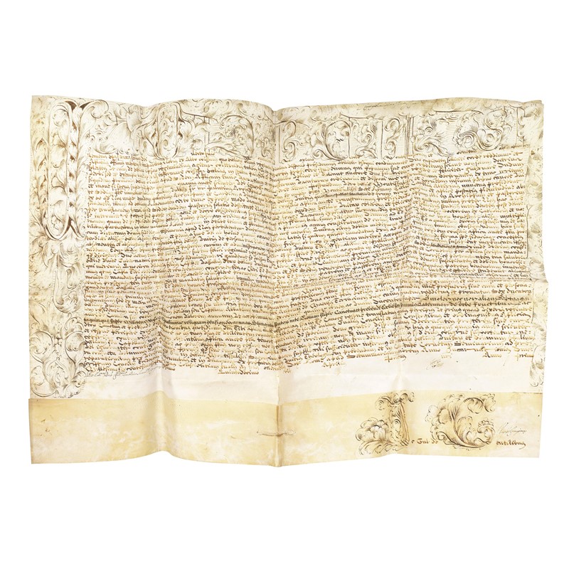 Grande pergamena manoscritta (ca. 927 x 624 mm), con bellissima decorazione floreale in alto e lungo il margine sinistro. Da studiare.
