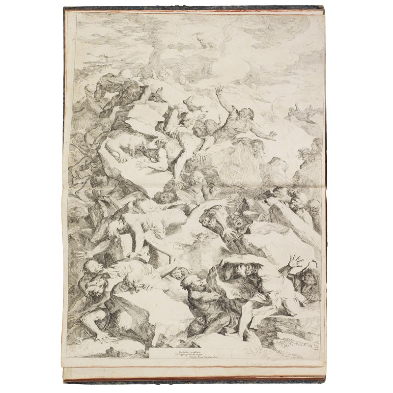 RARE AND CELEBRATED SERIES OF ETCHINGS engraved by Carlo Antonini over a century after the death of Salvator Rosa, an Italian painter, chalcographer and poet of the Baroque era but with a pre-romantic spirit, testifying to his enormous popularity. -- Lacks the first 5 pages indicated on SBN (which include title page and dedication), but it nonetheless appears complete (perhaps it is a different issue?) Light foxing on the first page, three of the final double-page engravings have a slightly trimmed margin, one engraving is not perfectly straight, old annotations in pencil at the bottom of all etchings (sometimes titles or short captions). It should be noted that the piece on the spine bears the same title as the first etching (“Delineamenta”), and therefore the title page is presumably missing from origin: it is in fact a beautiful genuine copy, with deep and clear engravings on thick watermarked paper with a lily in double circle above the initial “B”. Detailed description and additional images upon request.