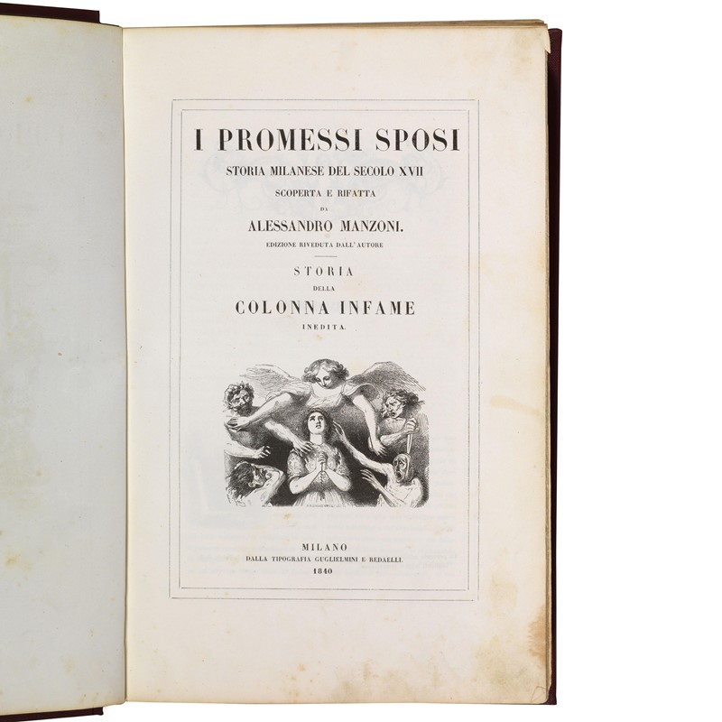 (Illustrati 800) MANZONI, Alessandro. I Promessi sposi. Storia milanese del secolo XVII scoperta e rifatta da Alessandro Manzoni. Edizione riveduta dall’autore. Storia della colonna infame, inedita. Milano, dalla Tipografia Guglielmini e Redaelli, 1840.