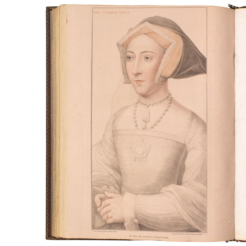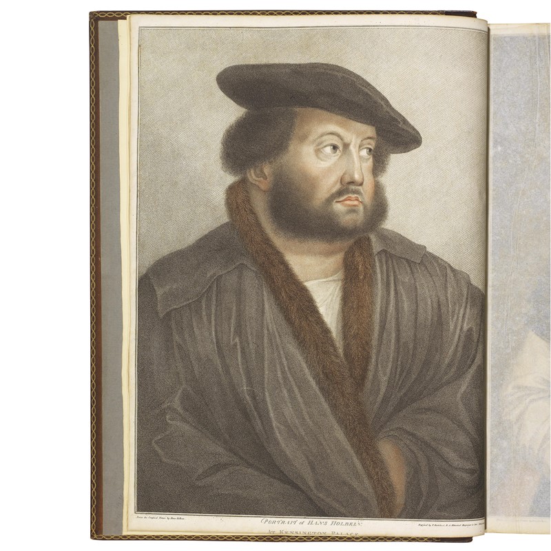 LA COPIA DI JOHN ROLAND ABBEY (1894-1969), grande bibliofilo inglese la cui collezione fu dispersa tra il 1970 e il 1975, autore di Life in England in Aquatint and Lithography, 1770-1860 (London, Curwen Press, 1953), nel quale scrive della presente opera “In every way a splendid book, the colour printing reproducing with extraordinary fidelity the original designs”. Queste Imitations sono la celebre stampa ottocentesca a colori dei ritratti disegnati da Hans Holbein (1497/8–1543) i cui originali, oggi conservati al castello di Windsor ma riscoperti dalla regina Carolina (1768-1821) in una scrivania nei suoi appartamenti a Kensington Palace, furono copiati e pubblicati in questa prestigiosa edizione sotto gli auspici di John Chamberlaine, custode dei disegni di Giorgio III dal 1791. La serie include i ritratti di importanti figure di corte (ad esempio Jane Seymour, Anne Boleyn, Sir Thomas More, King Edward VI), oltre a quelli di Holbein e di sua moglie in apertura. Le tavole sono importanti anche per la tecnica incisoria utilizzata da Francesco Bartolozzi (1727-1815), lo “stipple-engraving” (“maniera punteggiata”) a colori. Nel 1764, Richard Dalton, libraio di re Giorgio III, lo aveva convinto a trasferirsi a Londra, facendogli conferire il titolo di “Engraver to the King”. L’opera fu pubblicata in quattordici parti tra il marzo 1792 e il febbraio 1800. “This magnificent work is surely the finest example of English color printing.” (Ray).