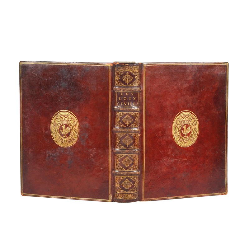 EDIZIONE ORIGINALE IN MAROCCHINO ROSSO ALLE ARMI DI LOUIS BOUCHERAT (1616-1699), conte di Compans e magistrato francese che occupò varie cariche politiche fino a quella di Cancelliere di Francia dal 1685 alla morte. L’opera, pietra miliare del diritto civile francese, ispirò tra l’altro l’Esprit des Loix di Montesquieu e più tardi il Code Civil. Jean Domat (1625-1696) è considerato dalla maggior parte degli storiografi come il più grande civilista francese del XVIII secolo. Di formazione giansenista, lavorò per la razionalizzazione del diritto francese, dandogli ordine e coerenza. il volume è adornato da magnifiche testatine incise tra cui una che rappresenta Mosè che riceve le Tavole delle Leggi. La presente copia è più completa di quella registrata da SBN in quanto ha il fascicolo “p” di 4 carte (non di 2), dove le due carte aggiuntive recano le “Tables des titres”.