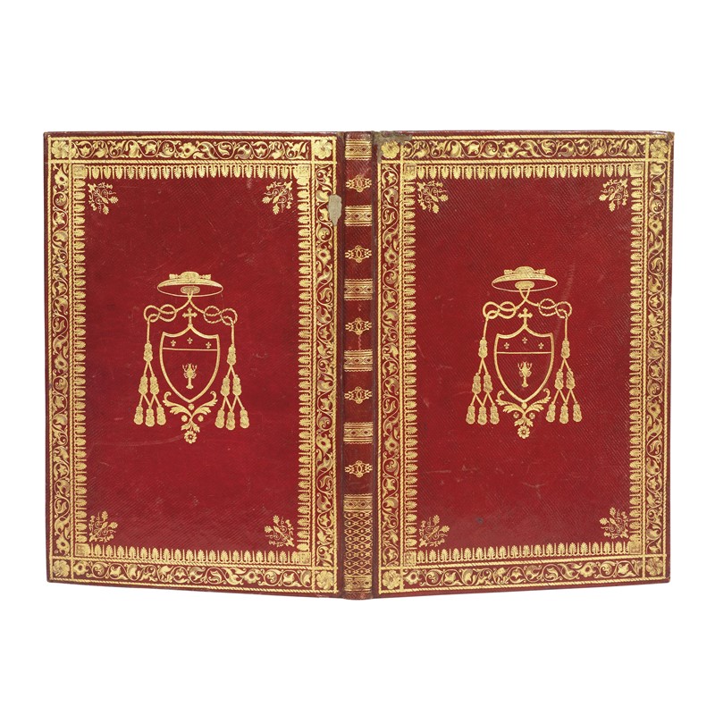 Elegant binding in red morocco with arms of a prelate. 19th century. Small loss on the rear cover. Not collated - sold as binding. Detailed description and additional images upon request.