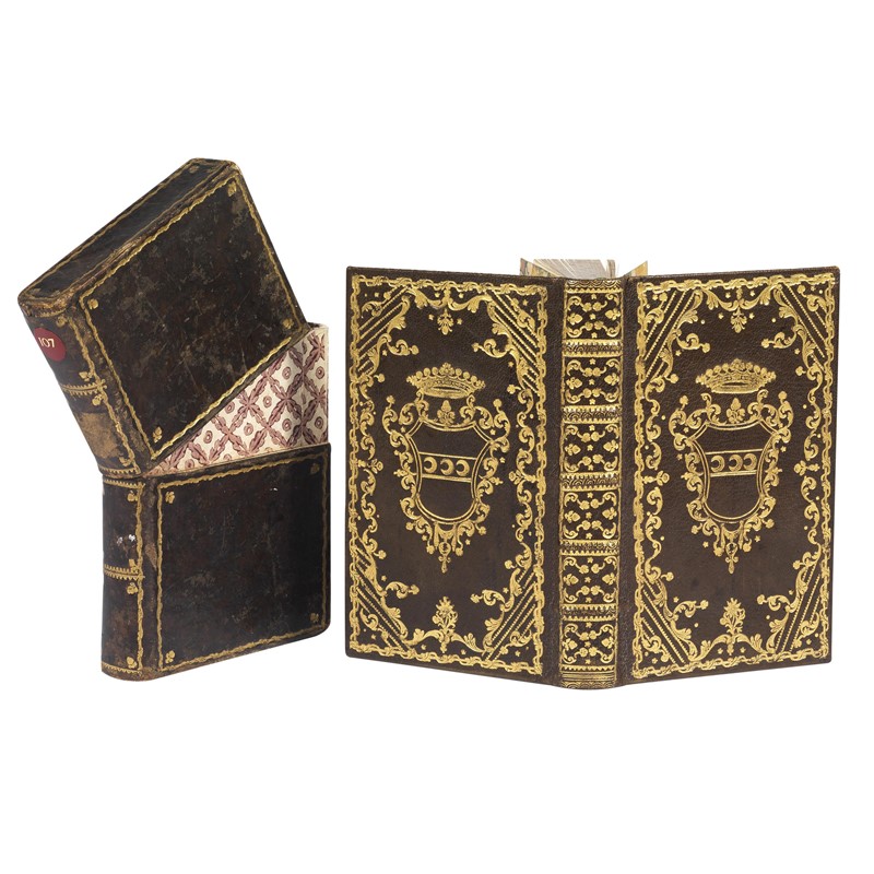 Officium Beatae Mariae Virginis. Venetiis, apud Nicolaum Pezzana, 1758. In 12mo (187 x 108 mm). [24] 405 [3] pp. [8] tavole calcografiche comprese nella segnatura. Strappetto a L7. Marocchino marrone riccamente decorato in oro ai piatti e al dorso, grandi armi con corona marchionale, unghiatura e dentelles dorate, tagli marezzati, dorati e goffrati, sguardie marmorizzate. Preservato entro la custodia a tasca originale. Minime tracce del tempo. Ex libris Arturo Dazza.