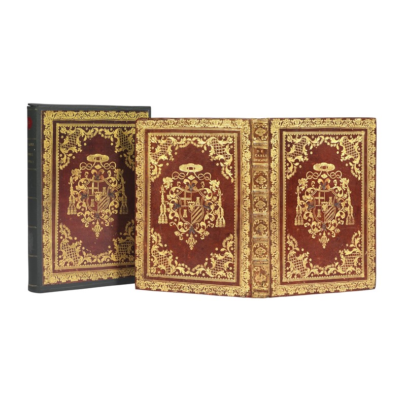 Luxurious Roman binding in red morocco with arms of Cardinal Carlo della Torre di Rezzonico (1693-1769), Pope Clement XIII from 1758, dedicatee of the work. Partially abraded stamp on frontispiece. Detailed description and additional images upon request.