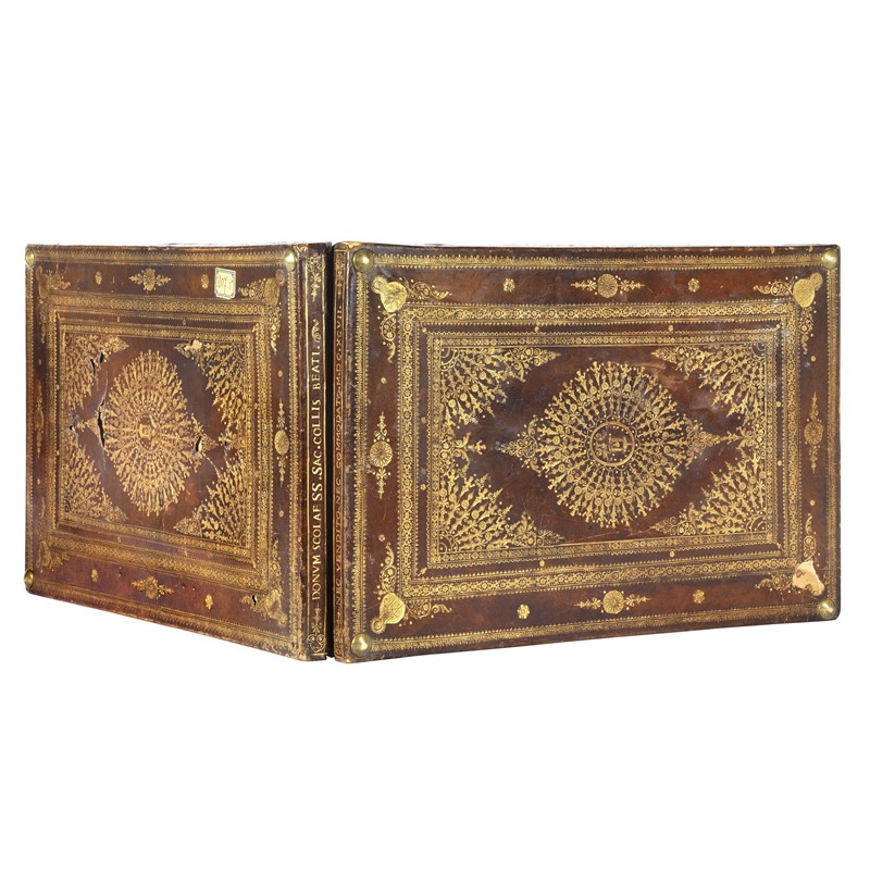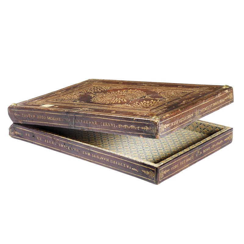 Grande custodia (ca. 310 x 450 x 83 mm) rivestita in pelle con fine decoro a ventagli e con figure di santi agli angoli, lungo i lati citazioni di canti sacri e la dicitura “Donum Scolae SS. Sac. Collis Beati - Nec vendito nec commodato M.DC.XCVII” con in piccolo la scritta “IO.IAC.ARDENGHI.F.” È esistito un Giovanni Giacomo Ardenghi, editore in Brescia di due drammi per musica pubblicati nel 1696, e Collebeato è una borgata della bassa Valtrompia a 5 chilometri da Brescia. L’interno della scatola è rivestito in carta decorata e presenta un gancetto per tenerla aperta (qualche difetto, cerniere un po’ arrugginite, assenti uno degli otto piedini e piccole porzioni di pelle).