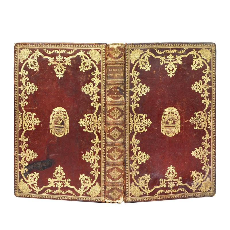 (Legature) Grande legatura alle armi di prelato. XVIII secolo. Marocchino rosso riccamente decorato in oro, ca. 400 x 250 mm), dorso e unghiatura dorati, sguardie marmorizzate, tagli dorati (macchia al piatto posteriore, qualche sbucciature, dorso sbiadito e sciupato alla testa e al piede). Contiene: Controversiarum Scholastico-polemico-historico-criticarum … tomus quintus … Milano, 1750, non collazionato, due tavole calcografiche.
