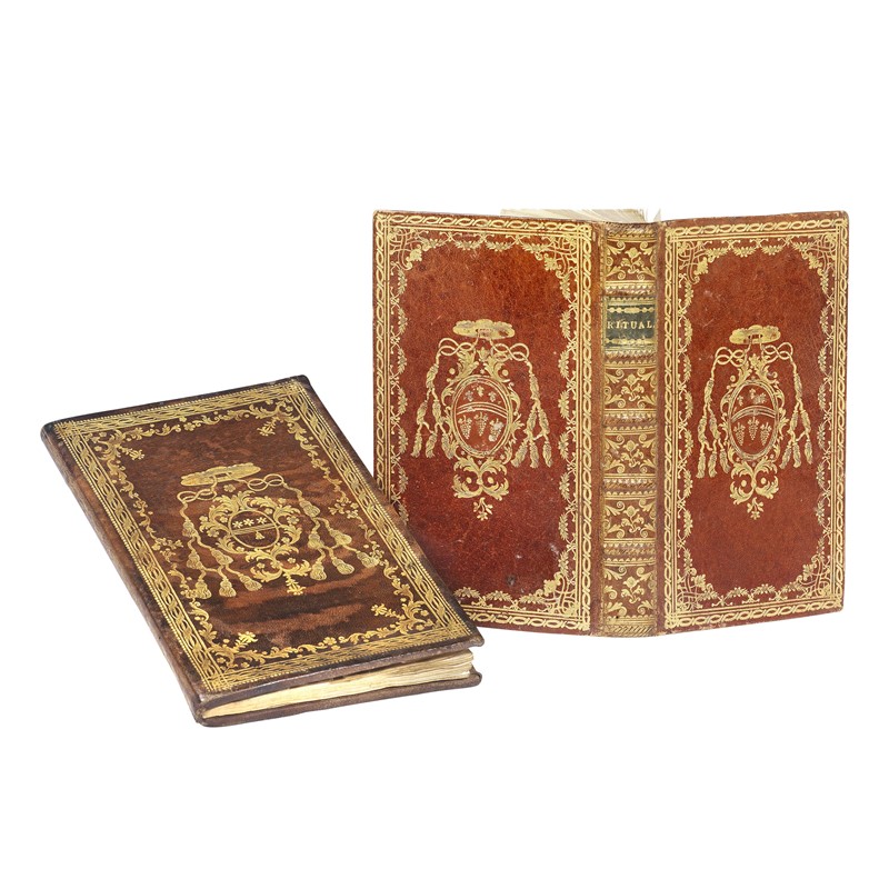 Rituale Romanum Pauli Quinti … 1794, non collazionato, testo stampato in rosso e nero. Bella legatura in vitellino nocciola con armi di prelato ai piatti entro cornici dorate, ca. 196 x 115 mm, dorso e tagli dorati. -- Propositiones Selectae … 1794, non collazionato, gore e altri difetti. Vitellino testa di moro con armi di prelato ai piatti entro cornici dorate, ca. 198 x 130 mm, piatti leggermente imbarcati. Lot of 2 bindings with arms of a prelate. 18th century. Not collated - sold as binding. Detailed description and additional images upon request.