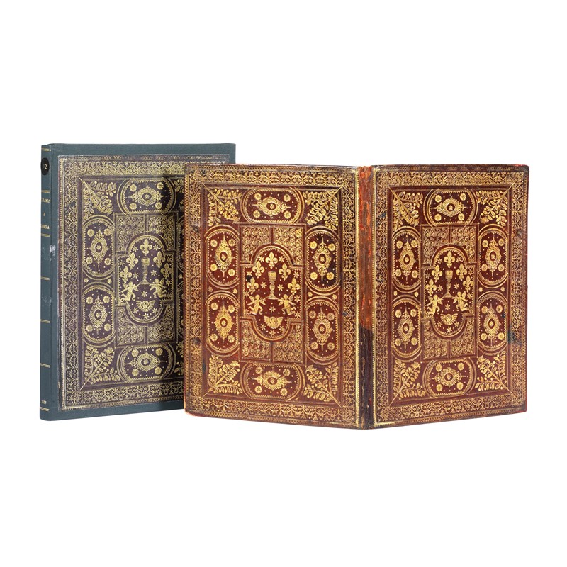 (Legature) Pregiata legatura romana del XVII secolo, vuota, presumibilmente bottega Andreoli. Marocchino rosso riccamente decorato in oro, agli angoli rami con bacche e piccola aquila, al centro putti che reggono un calice sormontato da quattro gigli, elementi araldici caratterizzanti le armi dei Principi Pamphili, 254 x 190 mm, sguardie in carta marmorizzata, minime tracce del tempo. Ex libris Arturo Dazza. In scatola moderna.