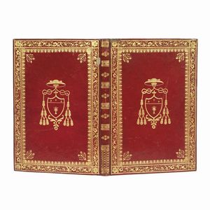 (Legatura) Elegante legatura in marocchino rosso alle armi di prelato. XIX secolo. Marocchino rosso con armi ai [..]