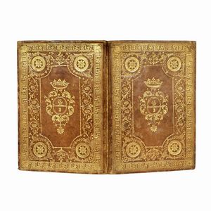 (Legatura) Bella legatura neoclassica con stemma Pianetti della Stufa. XIX secolo. Vitellino avana con armi coronate [..]