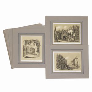 (Roma) Lotto di 11 stampe litografiche con vedute della Roma archeologica. Ca. 1830. Serie di 11 tavole litografiche [..]