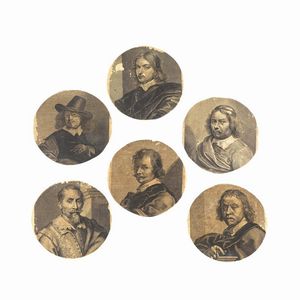 Lotto di 6 ritratti calcografici di pittori olandesi. XVIII secolo. Controfondati o intelati, diametro ca. 12° [..]