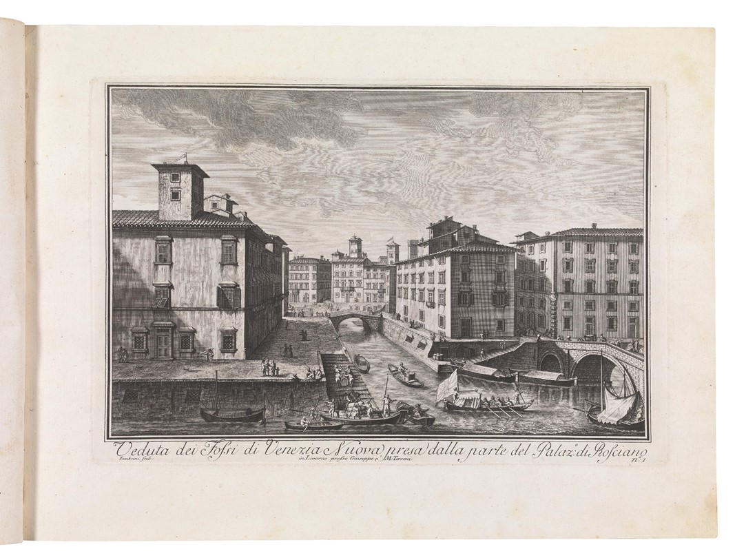 In 4to oblungo (347 x 470 mm). Frontespizio tipografico, dedica calcografica a Pietro Leopoldo, “Pianta della Città, e Porto di Livorno”, e 18 tavole numerate (la 9-10 tavola unica a doppia pagina) montate su brachette, di cui tre con margini esterni integrati da strisce di carta incollata e parzialmente staccate (tracce d’uso al margine inferiore, note di viaggio d’inizio Ottocento al verso di una tavola, restauro al verso dell’ultima tavola). Senza legatura.
