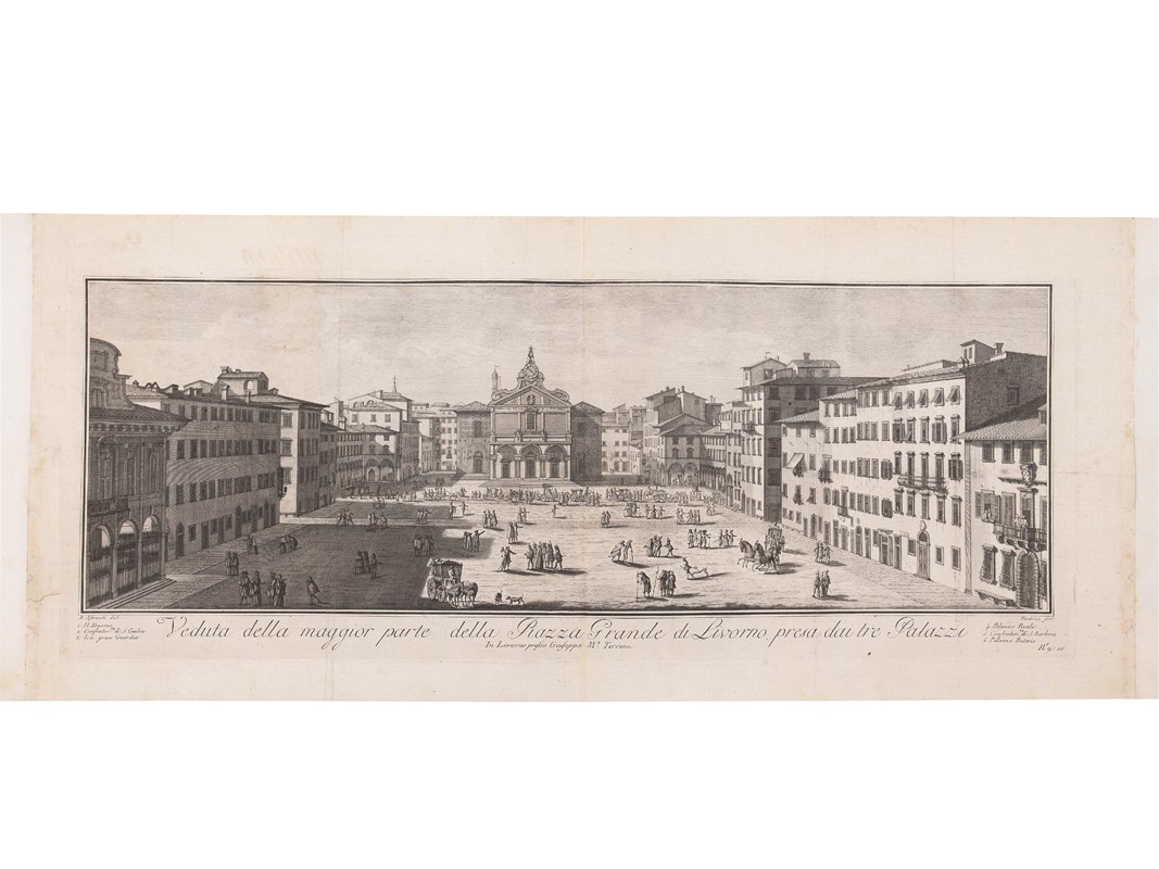 RARA SERIE DI VEDUTE DI LIVORNO, completa delle 18 tavole registrate da SBN, in fresca incisione. L’opera include una tavola doppia con la “Veduta della maggior parte della Piazza Grande di Livorno, presa dai tre Palazzi”, una “Pianta della Città e Porto di Livorno” con indice dei 46 monumenti principali, e bellissime vedute animate del porto, dei palazzi e dei dintorni della città, ciascuna con la propria didascalia incisa. Le note al verso della tavola 9 sono di un antico possessore che ha scritto qui le sue impressioni di viaggio sulle seguenti città: Milano, “città galante … molto a me piacevole, vista da me nell’anno 1804”, Livorno “città bella, ma piccola”, Firenze “città graziosa e grande … chiamata il giardino d’Italia”, Parigi “chiave di tutte le città” e infine Napoli “città galante ma gli abitanti sono di cattivo carattere e molto crudeli”.