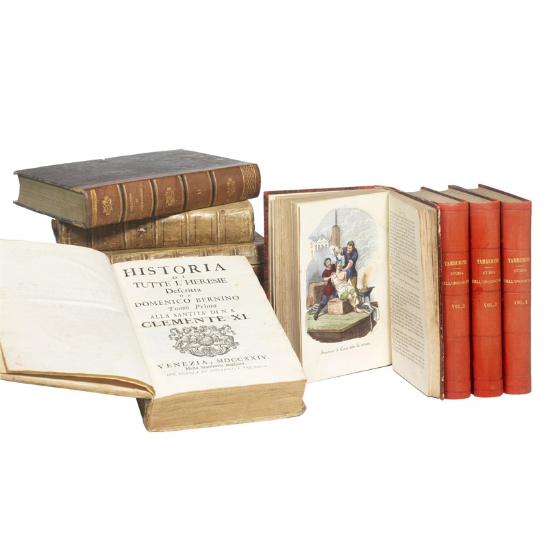 BERNINI, Domenico. Historia di tutte l’heresie. Tomo primo [-quarto]. Venezia, nella stamperia Baglioni, 1724. 4 volumi in 4to rilegati in pergamena rigida coeva (secondo volume senza tasselli al dorso, un bifolio sciolto nel terzo volume e altre trascurabili tracce del tempo). -- TAMBURINI, Pietro. Storia generale dell'inquisizione. Milano, per Francesco Sanvito, 1862. 4 volumi in 8vo rilegati in mezza tela rossa e illustrati da numerose tavole litografiche colorate a mano e lucidate “à la gomme”, tavole xilografiche in bianco e nero e vignette xilografiche nel testo (fioriture occasionali e altre tracce del tempo). -- Relazione di Gerusalemme antica e moderna. Volume VII. Firenze, Fumagalli, 1846. In 4to in mezza pelle testa di moro (il dorso reca tomo “II”) illustrato da in frontespizio litografico a colori, mappe ripiegate colorate a mano e da tavole calcografiche, e con tutte le pagine di testo inserite in una ricca cornice abitata (fioriture occasionali).
