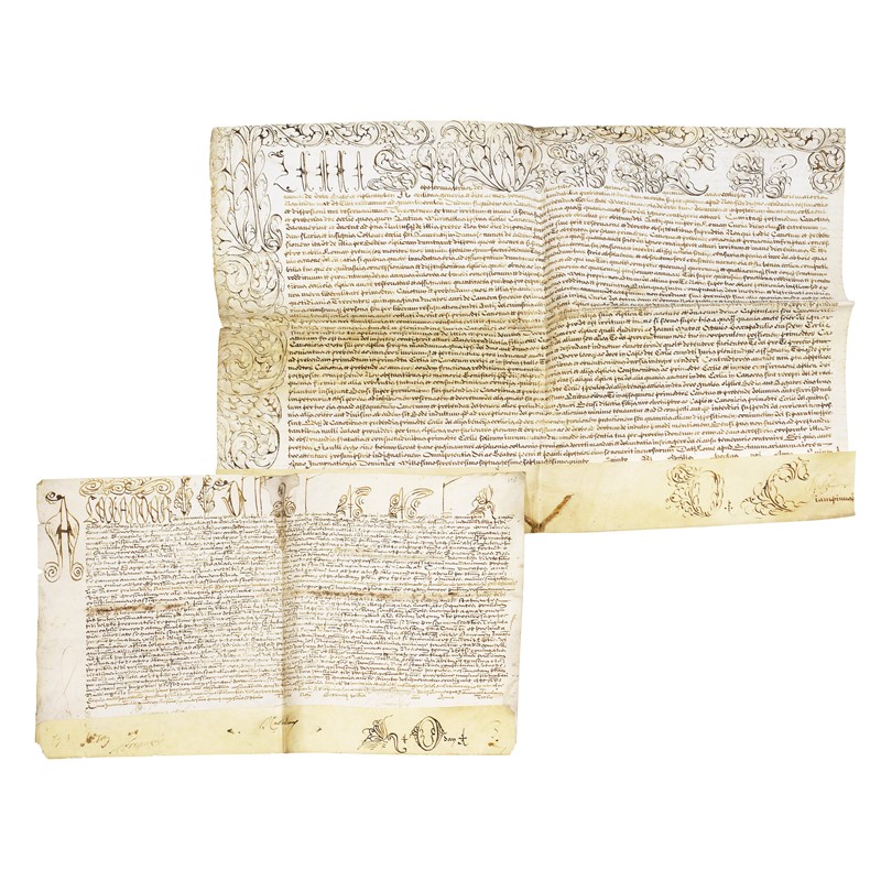 Una più grande (ca. 690 x 465 mm), con bella decorazione floreale in alto e lungo il margine sinistro, e una più piccola (ca. 534 x 370 mm) con la quale viene concessa una pensione a favore di un clerico. La più piccola: bolla di papa Alessandro VII (Fabio Chigi) del 22 settembre del 1657, data nel terzo anno del suo pontificato. La più grande: Litterae di papa Clemente X data in Roma, presso S. Maria Maggiore, il 5 aprile 1675 nel quinto anno del suo pontificato, per il Card. Francesco Barberini.