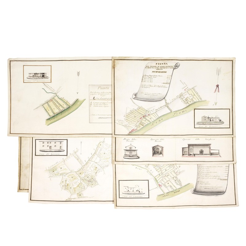 Bell’insieme di cabrei toscani, ca. 750 x 526 mm (quelli incorniciati ca. 830 x 600 mm), in fine acquarellatura coeva, che raffigurano i seguenti poderi con l’elenco dei relativi campi e boschi e le loro misurazioni: Podere di Valle Potesteria di Monte Lupo, popolo di S. Miniatello; Podere della Casetta posta nel popolo, e Potesteria di Monte Lupo; Podere di Vicinato posto nel Popolo di Malmantile, Potesteria di Monte Lupo; Podere della Rapaccia posto nel Popolo di Malmantile, Potesteria di Monte Lupo; Podere della Casalta, posto nel Popolo di S. Minatello, Posteria di Monte Lupo; Podere di Chiusura posto nel popolo di Samminiatello Posteria di Monte Lupo; Poggio alla Malva posto nel popolo di Malmantile, Posteria di Monte Lupo; Podere delle Querce posto nel Popolo e Posteria di Monte Lupo; infine: “Pianta, Spaccato e Alzata della Cappella, o sia Oratorio della Villa di Luciano”. -- Occasionali difetti trascurabili ai margini.