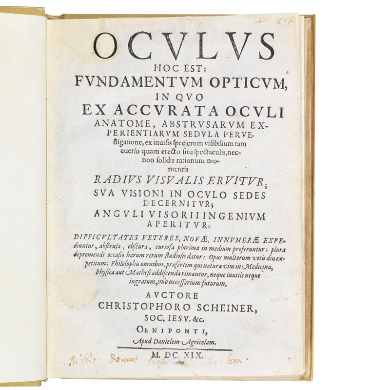 RARA PRIMA EDIZIONE DI QUESTO PIONIERISTICO TRATTATO DI OTTICA. L’intricata tavola calcografica, dedicata a Ferdinando II di Ungheria, raffigura una camera oscura e un sistema di lenti invertibili, oltre al telescopio, recentemente inventato. Scheiner condivide nell’Oculo le sue scoperte: senza conoscere l’esatta teoria della rifrazione della luce, vi confronta gli indici ottici delle diverse parti dell’occhio come il cristallino e l’umor vitreo, riconosce nella retina la sede delle sensazioni visive, descrive il raggio di curvatura della cornea, le terminazioni nasali del nervo ottico, il riflesso di contrazione della pupilla, ecc. Il diagramma schematico dell’occhio offerto dall’autore è stata la prima rappresentazione scientificamente accurata dell’occhio umano e come tale ha segnato un drammatico avanzamento rispetto alla secolare concezione galenica di questo organo.