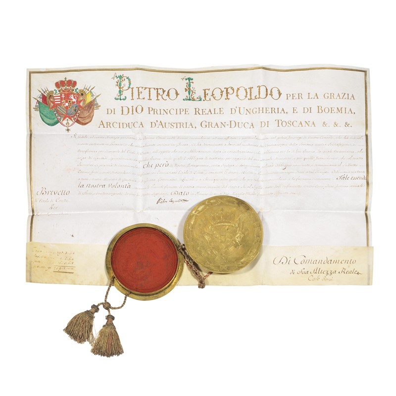 Grande pergamena ripiegata, ca. 450 x 715 mm, manoscritta in italiano, con grande stemma policromo di Pietro Leopoldo in alto a sinistra, intestazione dorata, firma di Pietro Leopoldo in calce. È fissato alla pergamena con cordicella in filo rosso e dorato grande sigillo in ceralacca di Pietro Leopoldo conservato entro scatola di metallo con stemma Asburgo-Lorena su un lato e iniziali “PL” sull’altro (diametro ca. 16,2 cm).