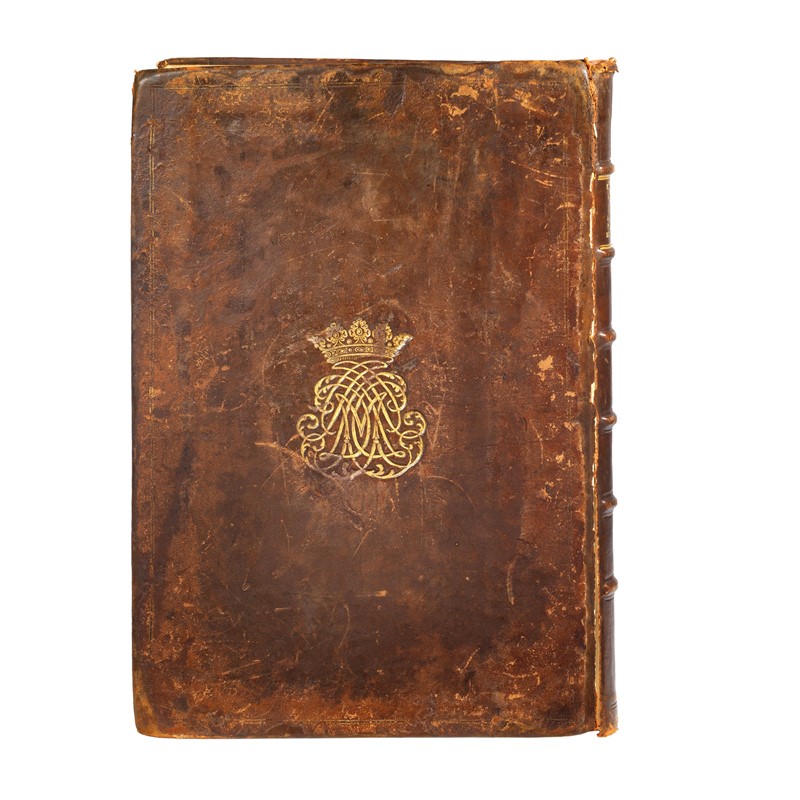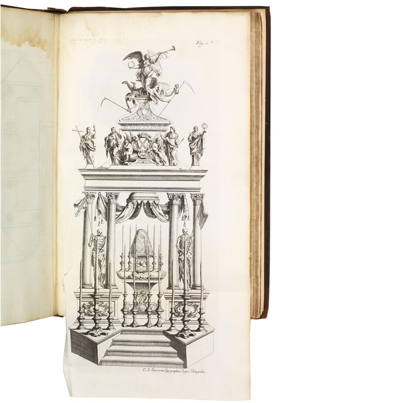 In folio (410 x 284 mm). [xl] 370 [2] pp. (ultima bianca), seguite da 33 incisioni calcografiche numerate (di cui una pianta a doppia pagina, 3 ripiegate e le altre a piena o mezza pagina). Frontespizio inciso, ritratto calcografico del Duca, testatine, iniziali e finalini calcografici, grande tavola ripiegata con corteo (intelata). Piena pelle coeva con grande monogramma coronato del Duca al centro di entrambi i piatti (dorso rinnovato, sbucciature e restauri, sguardie rinnovate). -- Sottile gora scura al margine superiore delle prime carte che si ingrandisce in modo intermittente da p. 280, carte occasionalmente ingiallite, piccolo foro con minima perdita alla p. 169, p. 329 con qualche macchietta, strappetto a una tavola ripiegata, per il resto copia genuina.