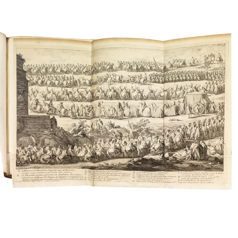 Elaborato libro funerario per Nuno Álvares Pereira de Melo (1638-1727), nobile portoghese e duca di Cadaval. Il testo fornisce molti sermoni elogiativi e dettagli sugli ultimi due anni della sua vita, dopo l’ictus nel 1725, mentre le splendide incisioni di T.A. Harrewyn, “Typographus Regis Portugaliae”, riproducono il corteo, gli apparati funebri, epitaffi ed elogi.
