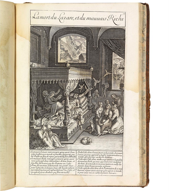 In 4to (260 x 183 mm). Frontespizio calcografico seguito da due carte con la lettera “Au Lecteur”, e poi da 70 tavole numerate 4-74 e da altre 54 tavole numerate 4-58; chiudono il volume due carte di testo incise. Vitellino coevo (difetti). Alle pagine iniziali antica scritta di appartenenza “à l’usage des soeurs de l’Infirmerie” del monastero “La Visitation Ste. Marie” di Parigi, distrutto durante la Rivoluzione, seguita da copie di lettere del “Reverend Pere de la Colombiere” a una monaca du quel monastero; in fine, copia tronca di lettera di Mme de Maintenon sul buon carattere. -- Ampia gora alla porzione superiore delle prime sessanta tavole, ma visibile soprattutto al verso, e altre minori tracce del tempo.