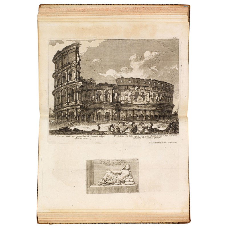 PRIMA EDIZIONE TEDESCA di questa galleria di vedute della Roma antica del pittore francese Jean Barbault (1705-1766), qui con le tavole incise da Georg Christoph Kilian (1709-1781). Barbault trascorse gran parte della sua vita a Roma e collaborò con Piranesi, concentrando la sua attività artistica sul disegno e incisione dell’architettura antica e di resti scultorei. Le tavole illustrano infatti templi, archi trionfali, anfiteatri, piazze, terme, acquedotti, rilievi antichi, iscrizioni ecc.