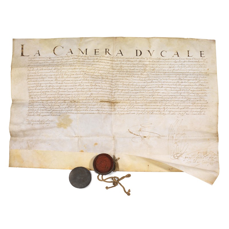 Grande pergamena manoscritta (ca. 590 x 400 mm), con intestazione “La Camera Ducale”, nella quale Francesco Grosso chiede che gli vengano affidati in eredità “castello luogo villa edefficii et territorio di Brusolo con sue pertinenze et deppendenze”. È appeso alla pergamena un piccolo sigillo in ceralacca con armi Savoia conservato nella sua scatolina di metallo (diametro ca. 6 cm).