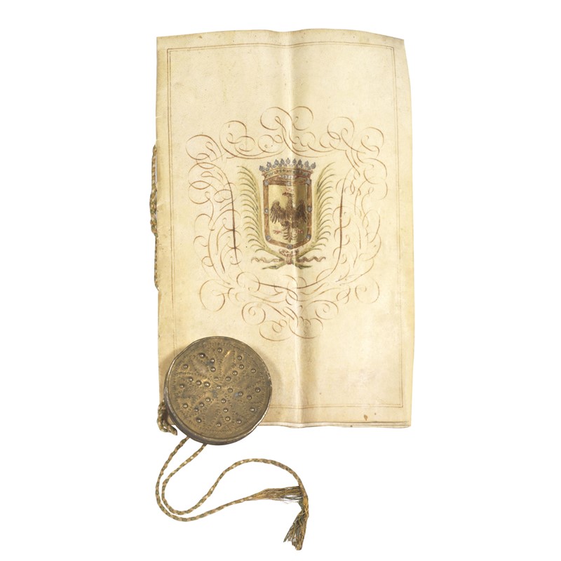 Manoscritto pergamenaceo (322 x 210 mm), di [4] carte in elegante grafia in italiano, intestazione dorata a Vittorio Amedeo di Savoia e grande lettera dorata, conservato entro foglio di pergamena più spesso con stemma coronato con aquila al piatto anteriore. Scrittura datata 2 maggio 1682, con la quale Giuseppe Francesco Grosso viene investito del Feudo di Chiano. Sigillo in ceralacca (non leggibile), in scatola di metallo decorato (diametro ca. 8 cm)