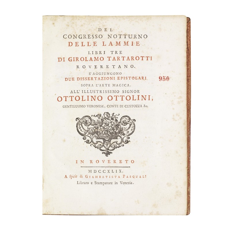 (Stregoneria - Vampirismo - Occulta) TARTAROTTI, Girolamo. Del congresso notturno delle lammie libri tre […]. S’aggiungono due dissertazioni epistolari sopra l’arte magica. In Rovereto, a spese di Giambatista Pasquali libraro e stampatore in Venezia, 1749.