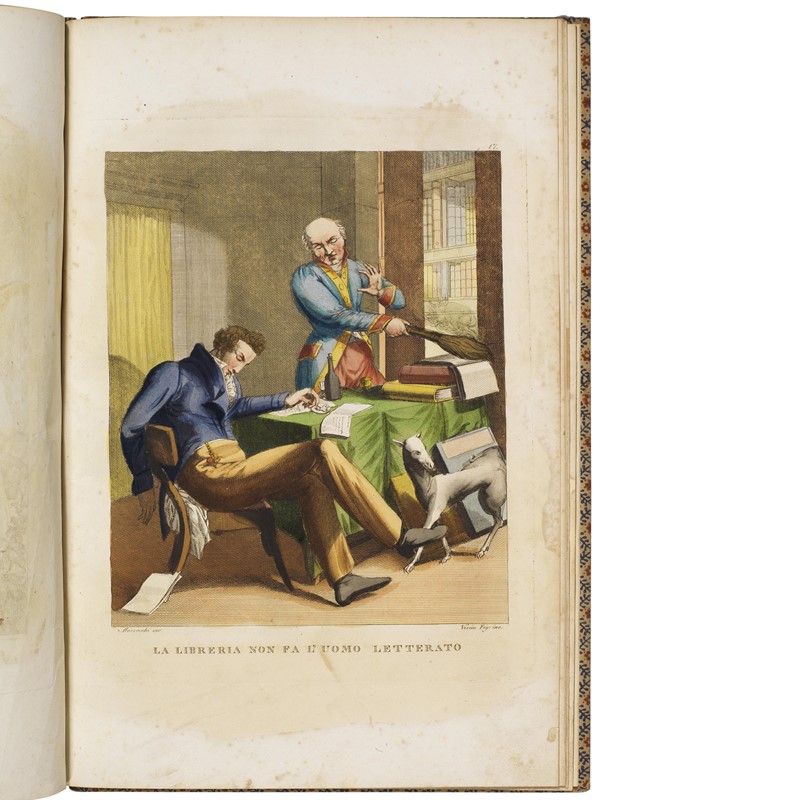 VERY RARE SERIES OF TUSCAN MOTTOES, COMPLETE AND WITH HAND-COLOURED PLATES. -- Pale foxing to the title page and the last three text pages (two of which have a stain to the upper margin). Pale stain to the top corner of four plates and two text ll., a plate and a few pages with a small marginal restoration in brown paper. Some plates have a slight sign of central fold and a couple of small holes, others are faintly browned presumably due to the application of polish; the whole was reassembled at the time of the binding. Detailed description and additional images upon request.