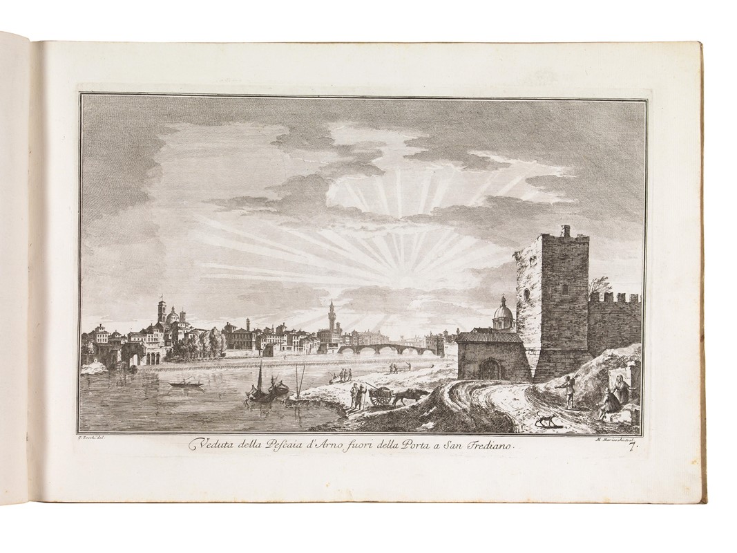 WONDERFUL COLLECTION OF TUSCAN VIEWS, fundamental for the Tuscan landscape and the iconographic documentation on the Medici villas and the Florentine nobility. Plates bound along the short edge, two are not numbered, and one is shorter. Detailed description and additional images upon request.