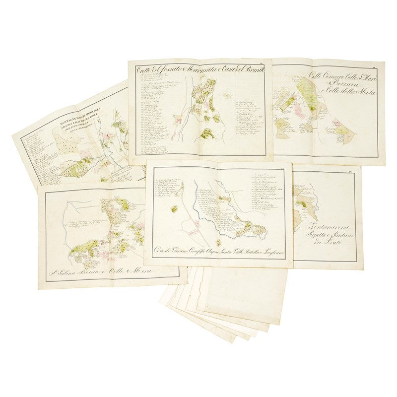 Insieme di cabrei toscani numerati, ca. 509 x 366 mm ciascuno, delicatamente acquarellati a mano, originariamente appartenenti a un insieme ora smembrato come si evince dai resti di brachette lungo la piegatura verticale al verso dei fogli. Le zone mappate sono: S. Sabina Biscia e Colle Mora; Crette del fossato Marmata e Casa del Romito; Montagna Massei Grotoli Valle della Mola; Mola del Bucco e Colle Cintiglio; Fontanarena Repetta e Pantani dei Frati; Conabosca Corolo Rosecco Colle del Ceraso; Colle Comare Colle Sta Maria Luzzara e Colle della Mola; Valle lunga, Valle dello Lato Murra e Formale de Paretti; Murra de’ Paretti, Pantano Ponte del Mocco; Prato Zanello; Territorio di Paliano, Tenuta che chiamasi Colle Gianturco; Coste di Varano Crocefisso Acqua Santa Valle Rotella e Frigliano.