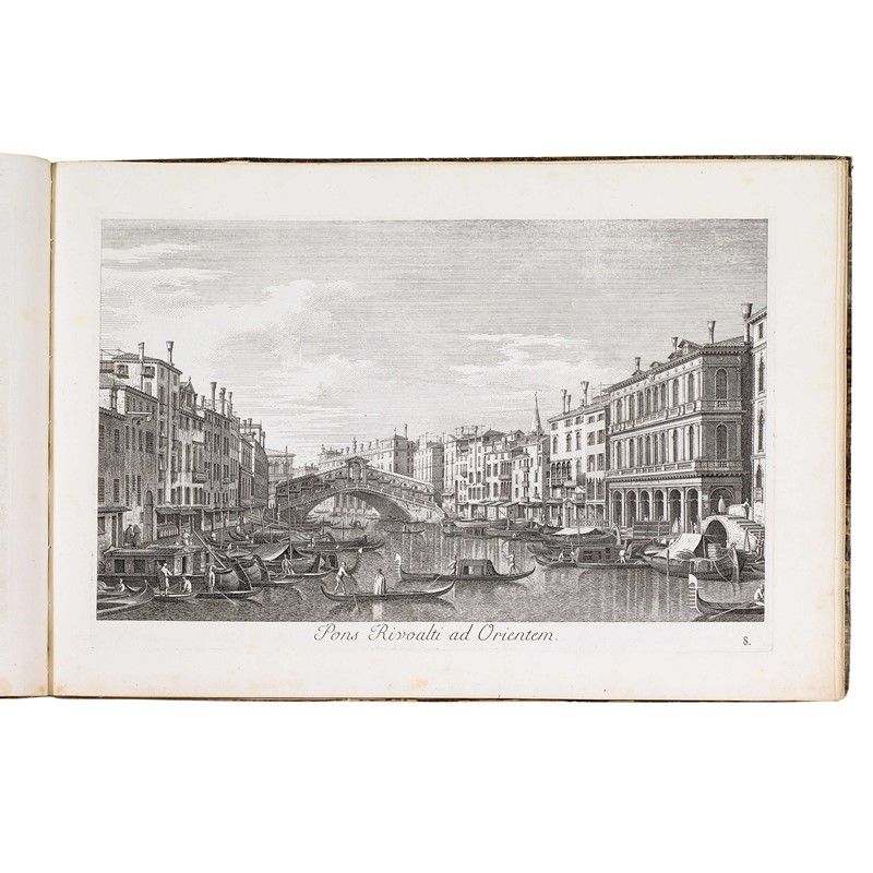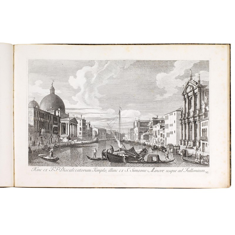 CELEBRE RACCOLTA DI 38 MAGNIFICHE VEDUTE incise da Antonio Visentini sui dipinti del Canaletto all’epoca nella collezione di Joseph Smith (1673/4?-1770), diplomatico inglese, collezionista di libri e mecenate che conobbe Canaletto verso il 1720 e che dal 1729 circa fino al 1735 controllò la sua intera produzione, sia acquistando quadri per se stesso, sia commissionando lavori per altri mecenati inglesi. L’album si apre con il frontespizio inciso Prospectus Magni Canalis Venetiarum, addito Certamine Nautico et Nundinis Venetis, seguito dalla tavola con i ritratti di Canaletto e di Visentini da dipinti del Piazzetta, da 14 tavole numerate in numeri arabi (i cui originali sono oggi di proprietà della Regina d’Inghilterra e si trovano al castello di Windsor), dalle 12 tavole della seconda parte numerate in numeri romani, e dalle altre 12 tavole numerate in numeri arabi che costituiscono la terza parte dell’opera. Sono assenti i tre frontespizi tipografici che introducono ogni parte, e la carta con l’elenco delle tavole. La prima serie di tavole fu pubblicata a Londra, da Joseph Smith, nel 1735. Le vedute, notissime, sono strepitose.