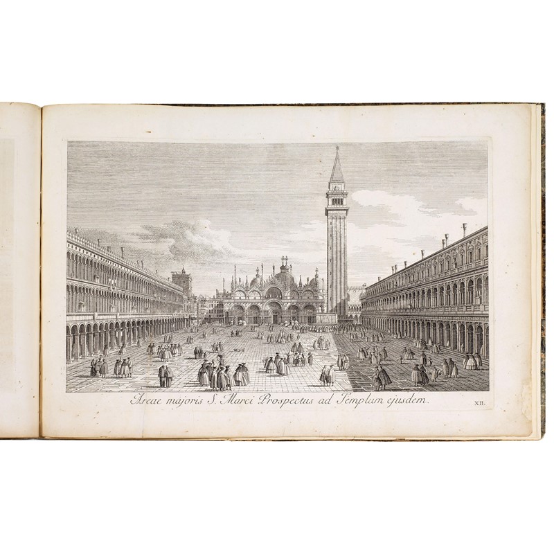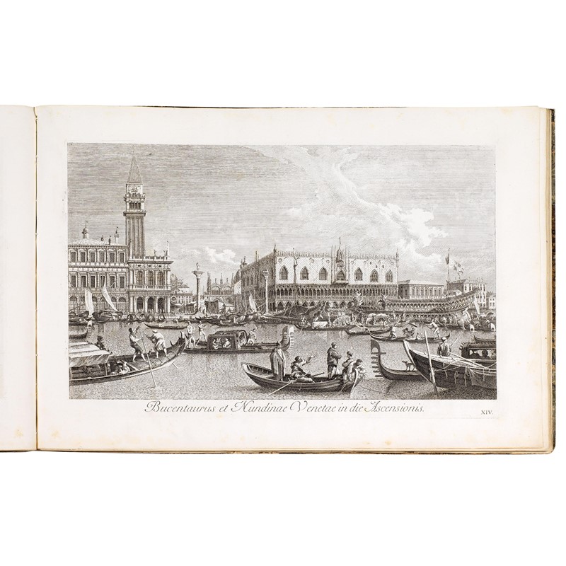 FAMOUS COLLECTION OF 38 MAGNIFICENT ENGRAVED VIEWS made by Antonio Visentini after Canaletto’s paintings at the time in the collection of Joseph Smith (1673/4? -1770). 40 chalcographic plates numbered as follows: [2] XIV 12 XII. -- Contemporary boards with renewed endpapers; the album was resewn in modern times. Lacks the three typographic title-pages that introduce each part and the leaf with the list of the plates, frontispiece with fold and with traces of use in the margin, occasional minimal foxing at the margins (more evident in the margin of plate XII of the first part), plate II of the third part with restored tear. Overall good, with very fresh engravings. Detailed description and additional images upon request.