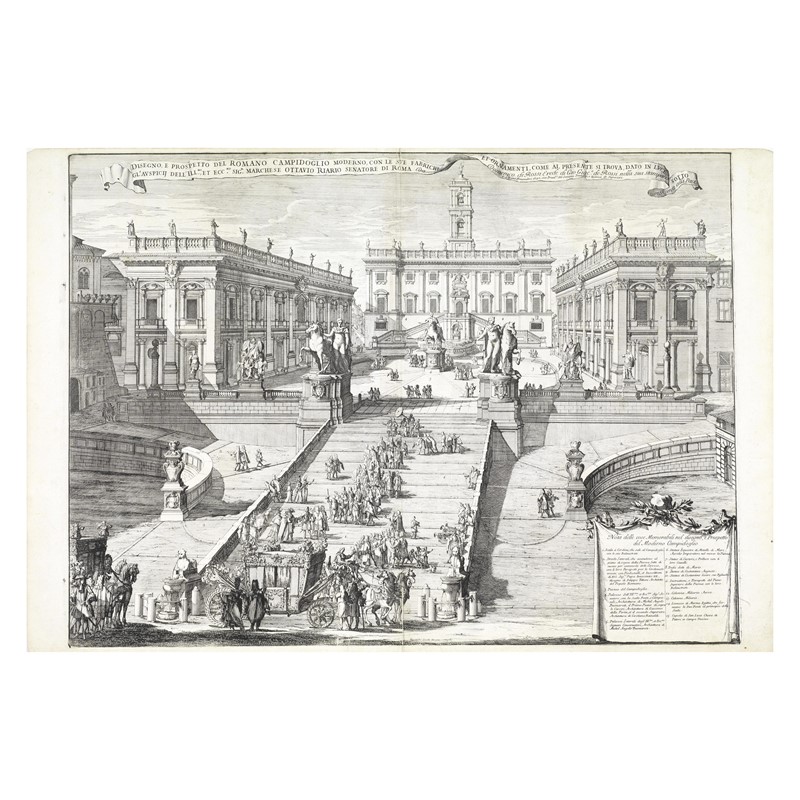FRONTAL VIEW OF THE CAMPIDOGLIO etching and engraving, watermarked laid paper, mm 490x665 (plate) lettered in banner along top 'Disegno e prospetto del Romano Campidoglio moderno ...Marchese Ottavio Riario Senatore de Rome da Domenico de Rossi ... sua stamparia in Roma all pace il de primo Novembre 1692'. Bottom right tablet has a key to the main features 'Nota delle cose memorabili nel disegno e prospetto del moderno campidoglio' bottom centre 'Alessandro Spechi disegno e intaglio'.