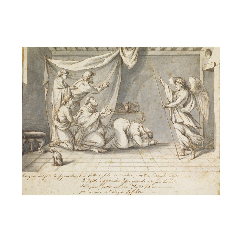 Iscrizioni “Bisogna slargare le figure che stanno tutte in fila in ginocchio e mettere l’Angelo in mezzo / Il soggetto rappresenta Tobia quando riacquista la vista / dall’unguento fatto da suo figlio Tobiolo / per comando dell’Angelo Raffaele” a penna in basso