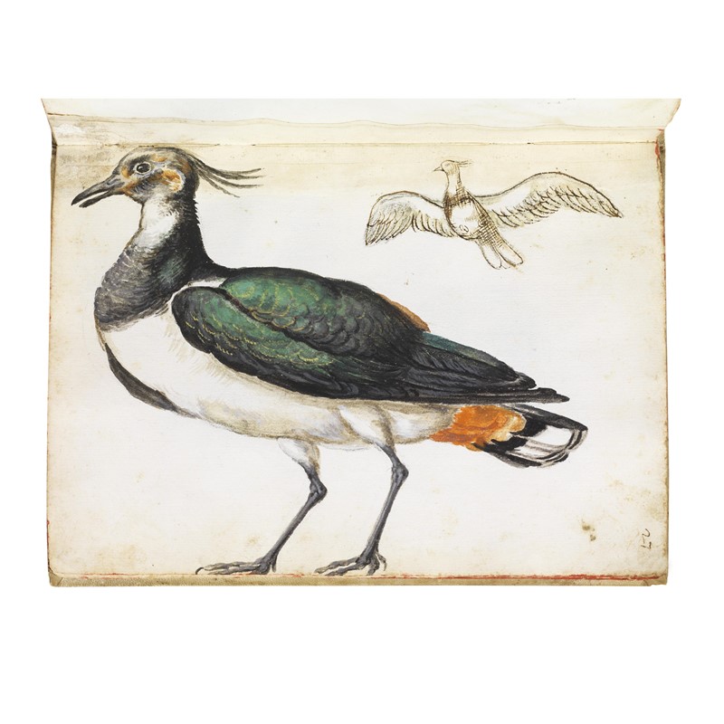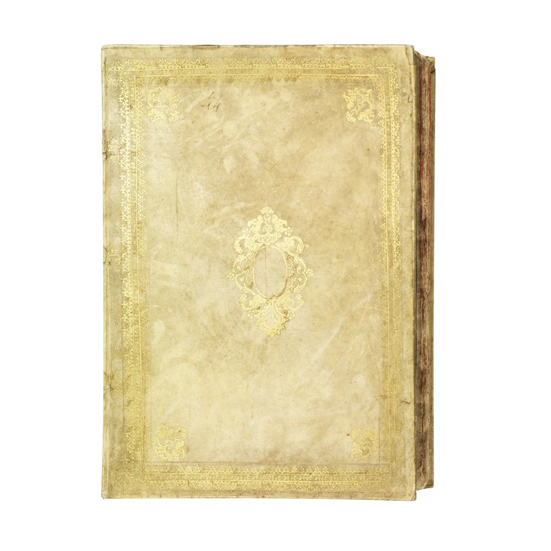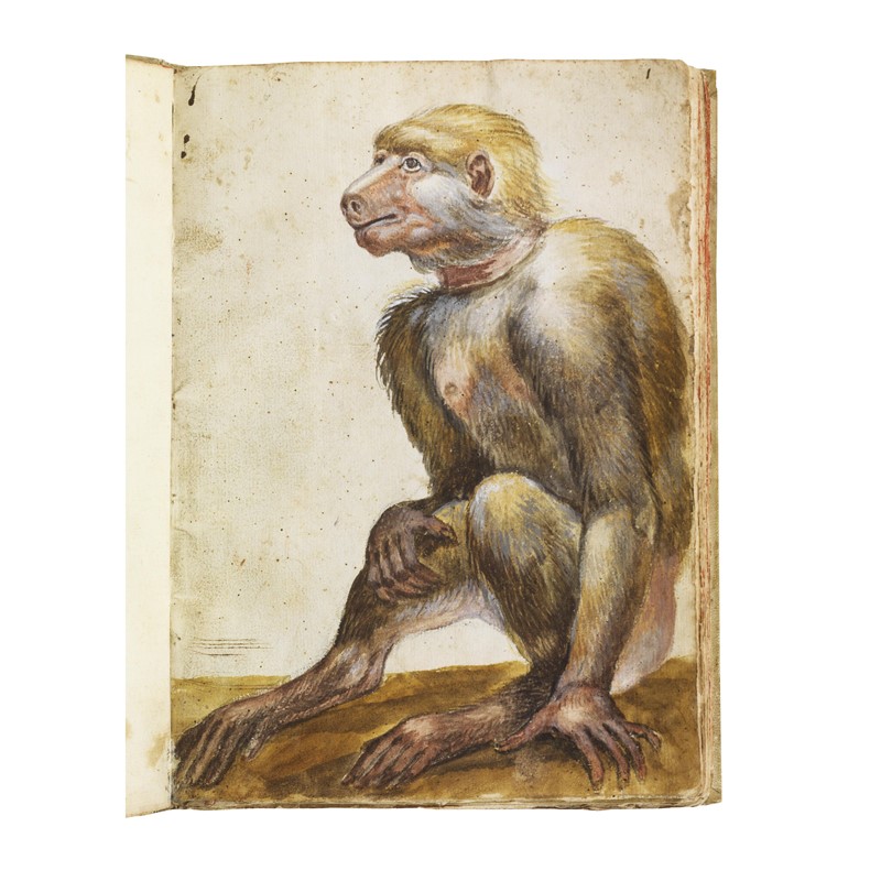 volume rilegato in pergamena decorata in oro contenente trenta tavole raffiguranti animali dipinti a mano, matita nera, pennello e inchiostro acquarellato su carta vergellata e filigranata, mm 285x215