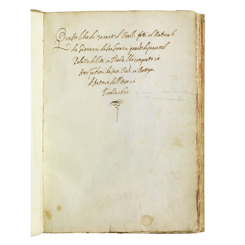 A penna sul frontespizio Questo libro di 30 carte d'Uccelli fatti al naturale / da Giovanni da San Giovanni quando dipinse nel / Palazzo de Pitti in Firenze l'ho comprato io / Atto Fabroni da suoi allievi in Bottega d'Antonio dell'Orso in / Firenze 1640