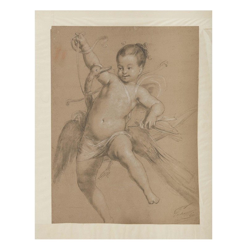 Gli affreschi delle stanze di Palazzo Torlonia a Roma, demolito nel 1902, sono ben documentati da fotografie d'epoca e dai cartoni sopravvissuti conservati al Museo di Roma a Palazzo Braschi. Il bel disegno offerto si aggiunge a tale documentazione in quanto modello preparatorio per uno dei putti con emblemi della caccia che andarono ad abitare la serie di lunette che correva tra parete e soffitto nella stanza dedicata alla dea Diana, affrescata da Francesco Podesti per volere del principe Alessandrio Torlonia, committente dei cicli decorativi più importanti nella Roma della prima metà dell'Ottocento.