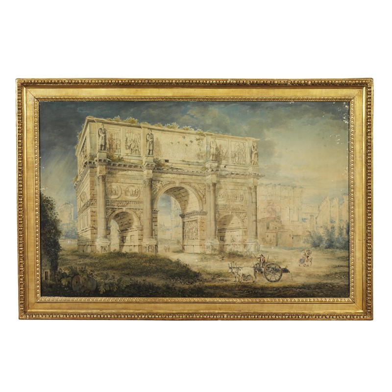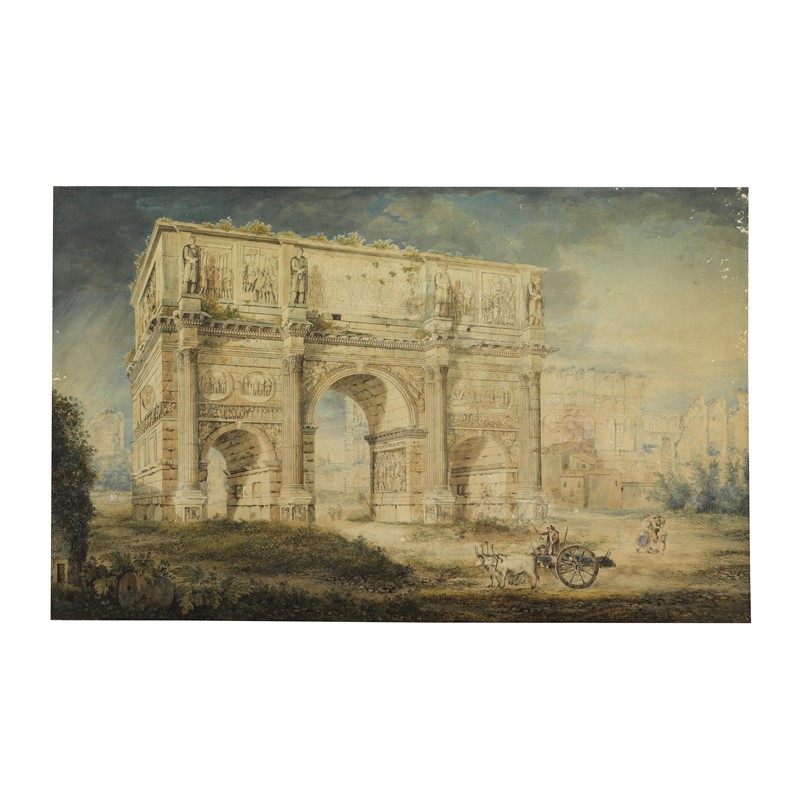 Franz Kaisermann (Yverdon, 1765 – Roma, 1833) ARCO DI COSTANTINO E PARTE DI COLOSSEO penna e inchiostro, penello e acquerello su carta, cm 76x123 firmato in basso a sinistra sulla colonna "Keiserman / Roma"