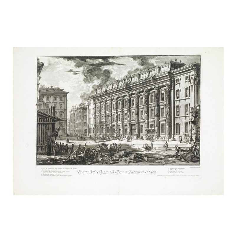 Giovan Battista Piranesi (Venezia 1720 - Roma 1778) VEDUTA DELLA DOGANA DI TERRA A PIAZZA DI PIETRA (SERIE: VEDUTE DI ROMA) acquaforte su carta vergellata, mm 447x605 (le due lastre) firmata a destra sulla lastra con il titolo e spiegazione "Piranesi Architetto fec.' e in basso con i dettagli di produzione "Presso l'Autore a Strada Felice nel palazzo Tomati vicino alla Trinità de' monti. A paoli due e mezzo"