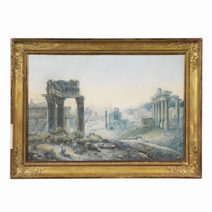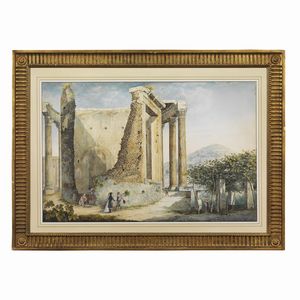 Scuola Romana, inizio sec. XIX IL TEMPIO DI VESPASIANO penna e inchiostro, pennello e acquarello su carta, cm [..]