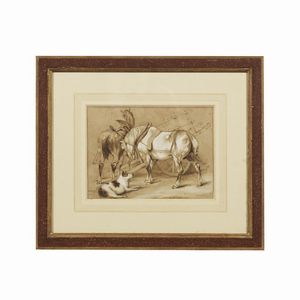 Pierre Frédéric Lehnert (1811- post 1880) CAVALLI E CANE matita nera, pennello e inchiostro acquarellato [..]