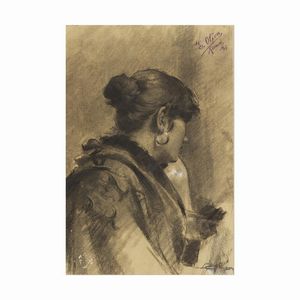 Artista romano della fine del sec. XIX PROFILO DI DONNA carboncino e gesso bianco su carta, mm 275x185 firmato [..]