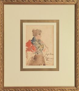 Pietro Fragiacomo (Trieste 1856 - Venezia 1922) STUDIO DI DONNA CON CESTO acquerello su carta, cm 16,5x12 siglato [..]