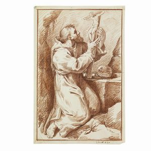 Scuola francese, sec. XVIII SAN FRANCESCO IN ADORAZIONE DEL CROCIFISSO matita rossa, carta vergellata filigranata, [..]