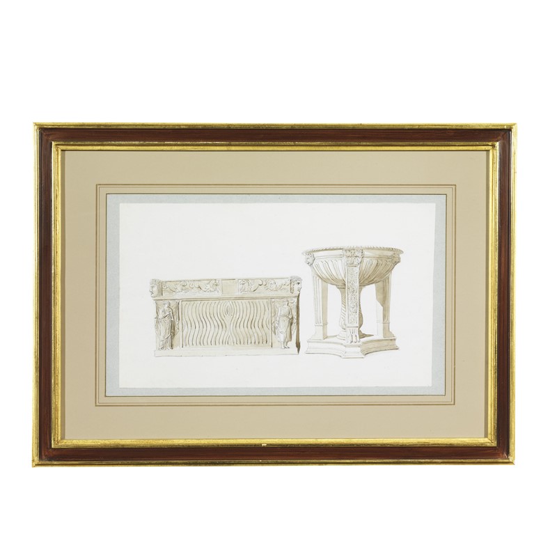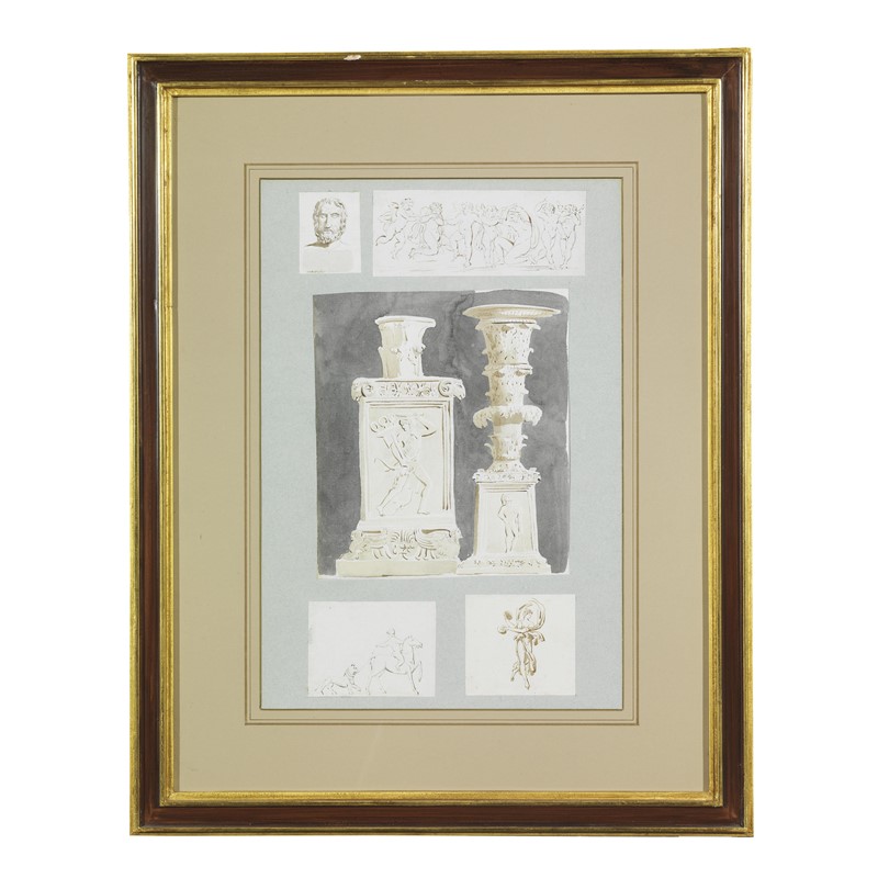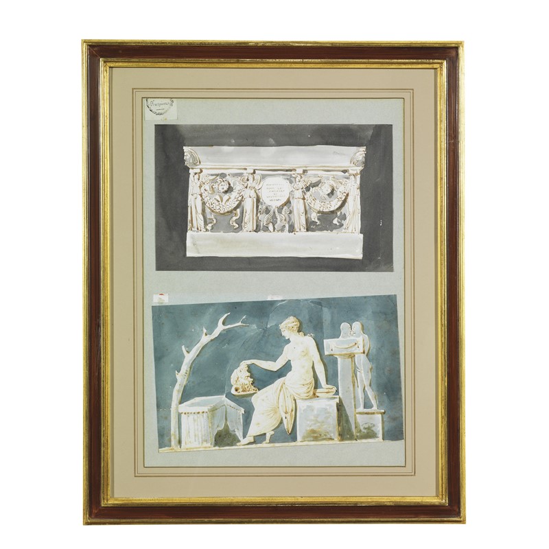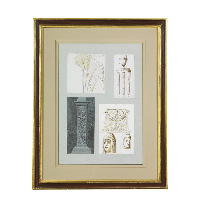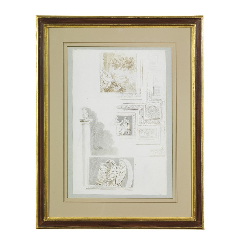 Gli eleganti disegni provengono da un album che raccoglieva su pagine di cartoncino verde azzurro studi di decorazioni ed esempi di statuaria classica presenti nelle collezioni romane del tardo Settecento, di mano di Pierre François Léonard Fontaine - come testimonia anche l'ex libris con iscrizione "P. F. L. Fontaine" entro ghirlanda sull'esemplare con un sarcofago e un rilievo dionisiaco -, famoso architetto e ornatista che insieme a Charles Percier contribuì all'invenzione dello stile impero e alla sua divulgazione attraverso l'attività incisoria. L'architetto risiedette a Roma dalla fine del 1785 al 1791, anni a cui devono essere fatti risalire i disegni presentati.