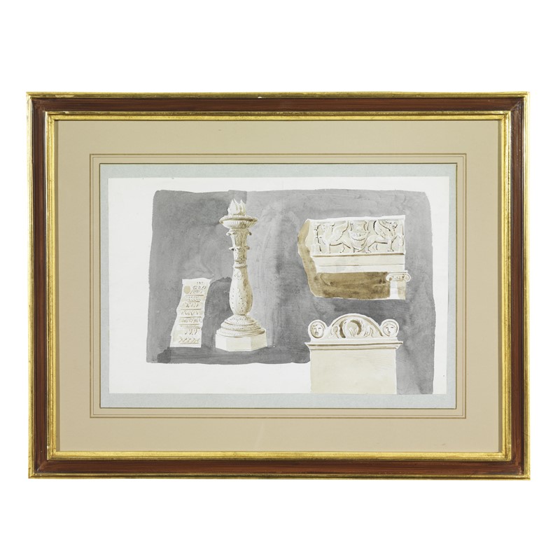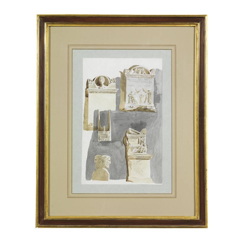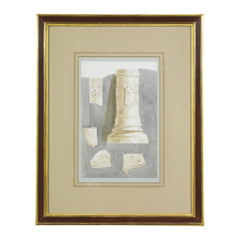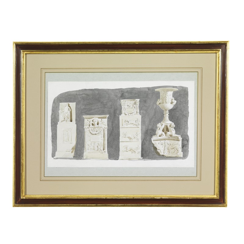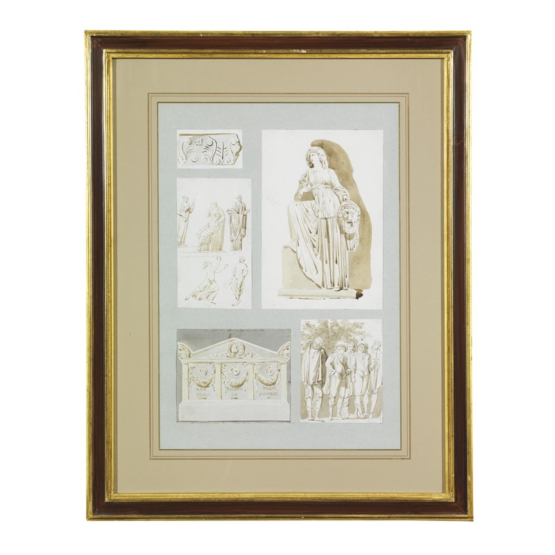 Gli eleganti disegni provengono da un album che raccoglieva su pagine di cartoncino verde azzurro studi di decorazioni ed esempi di statuaria classica presenti nelle collezioni romane del tardo Settecento, di mano di Pierre François Léonard Fontaine - come testimonia anche l'ex libris con iscrizione "P. F. L. Fontaine" entro ghirlanda sull'esemplare con un sarcofago e un rilievo dionisiaco -, famoso architetto e ornatista che insieme a Charles Percier contribuì all'invenzione dello stile impero e alla sua divulgazione attraverso l'attività incisoria. L'architetto risiedette a Roma dalla fine del 1785 al 1791, anni a cui devono essere fatti risalire i disegni presentati.