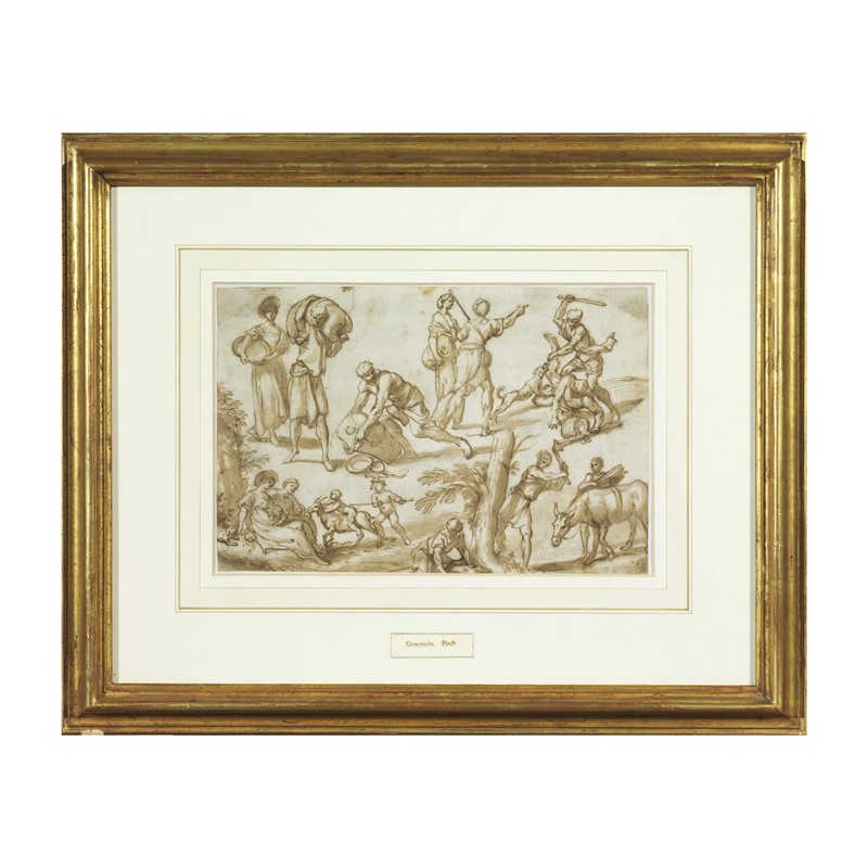 Il foglio è interessante e preziosa testimonianza del metodo compositivo utilizzato dal prolifico atelier di Domenico Piola, leader nel panorama artistico genovese dei decenni finali del Seicento. I diversi raggruppamenti di figure lì studiati venivano utilizzati all'interno di scene poi tradotte in pittura, o con altre tecniche, per esempio da artisti specializzati nel genere del paesaggio come Carlo Antonio Tavella che, secondo la testimonianza di Carlo Giuseppe Ratti, si valeva di quelle abbozzate figurine, giudiziosamente adattandole e rendendole tutte sue (Ratti 1769, p. 203).